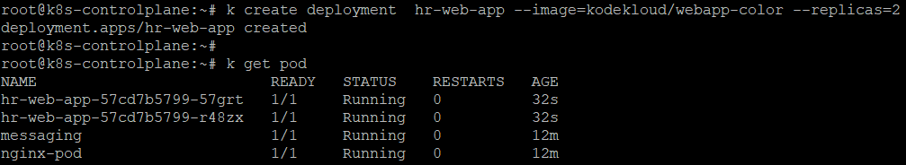 k create deployment hr-web-app --image=kodekloud/webapp-color --replicas=2