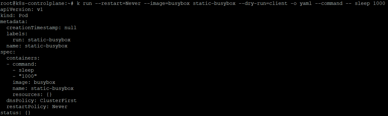 k run --restart=Never --image=busybox static-busybox --dry-run=client -o yaml --command -- sleep 1000 > /etc/kubernetes/manifests/static-busybox.yaml