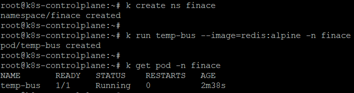 k run temp-bus --image=redis:alpine -n finace