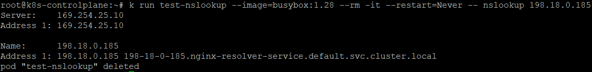 k run test-nslookup --image=busybox:1.28 --rm -it --restart=Never -- nslookup 198.18.0.185